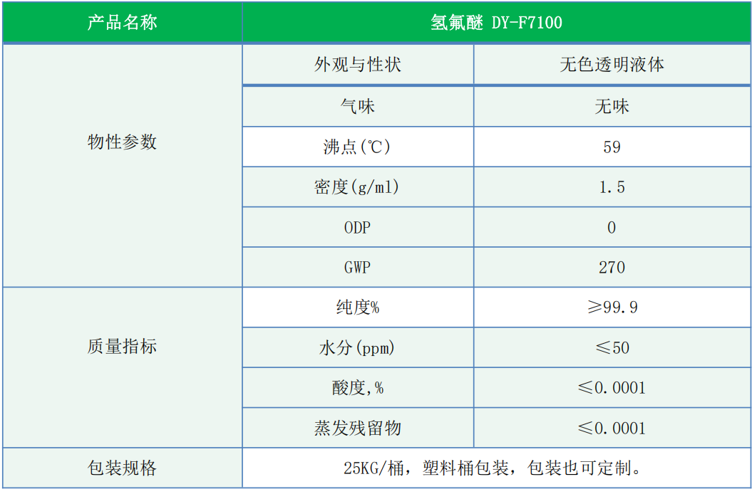 DY-F7100 是一种无色无味的透明液体,它具有无闪点、臭氧消耗潜能值为零、低 GWP、优异的稳定性和材料兼容性等特点,广泛应用于医疗、电子、金属、精密器械、光学镜片、通信及航空航天等众多领域,是一种环境友好的溶剂和清洗剂。
